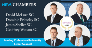 Congratulations to David McLure SC, Dominic Priestley SC, James Sheller SC, and Geoffrey Watson SC on their recognition in the recently released Doyle’s Guide rankings for Leading Professional Indemnity Law Senior Counsel in New South Wales.